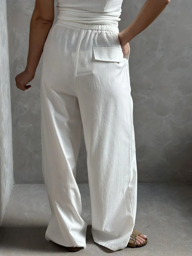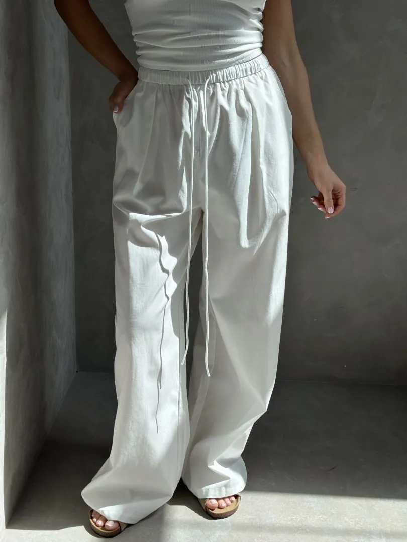 Брюки из хлопка в белом цвете. Они имеют свободный крой, эластичный пояс с шнурком для регулировки посадки.