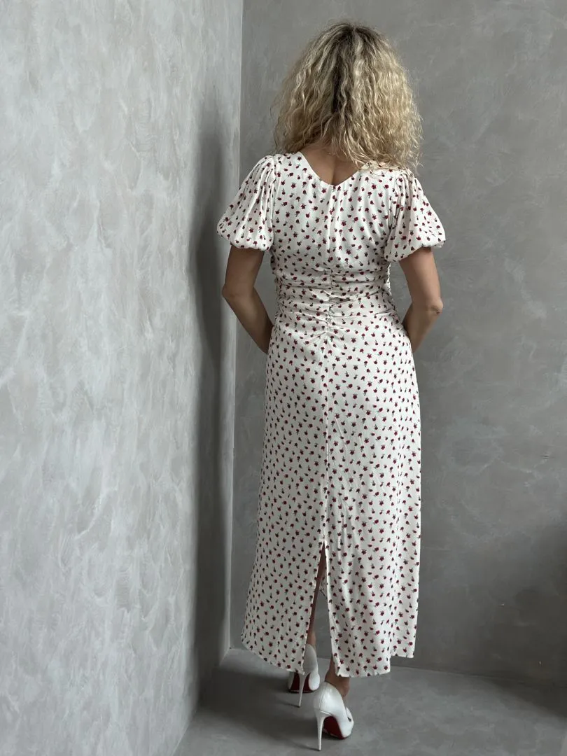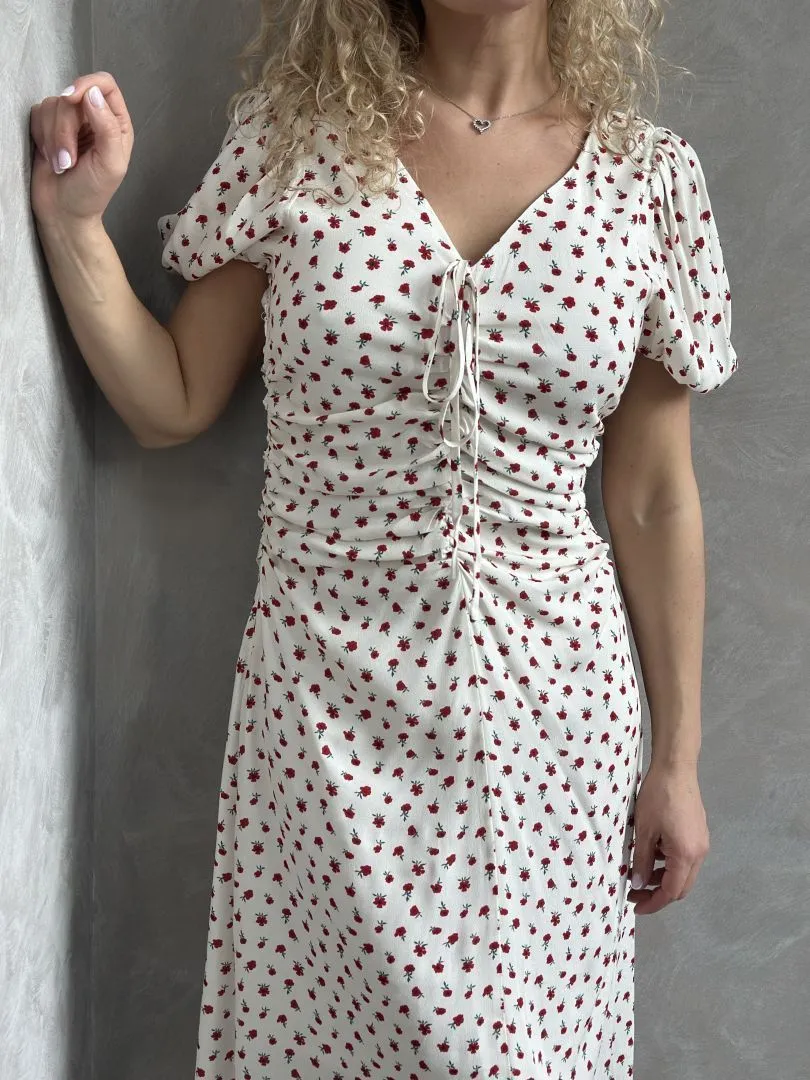 Платье миди с цветочным принтом. Платье имеет V-образный вырез, короткие рукава фонарик и пояс, который подчеркивает талию.