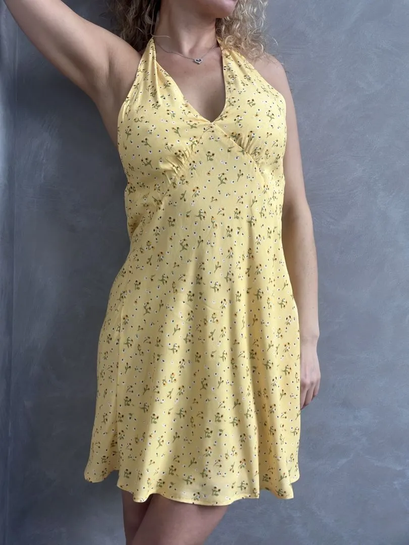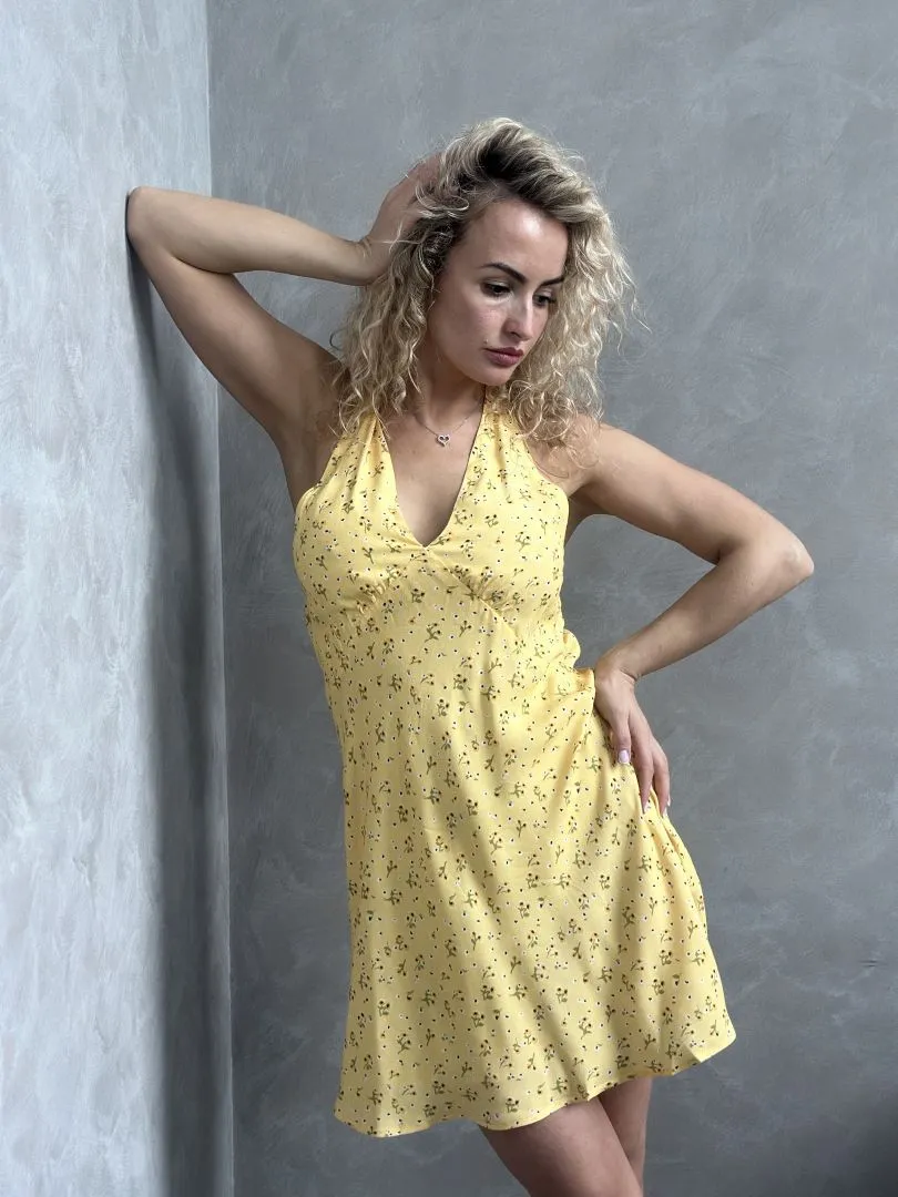 Платье с открытой спиной, выполненное в желтом цвете с мелким цветочным принтом