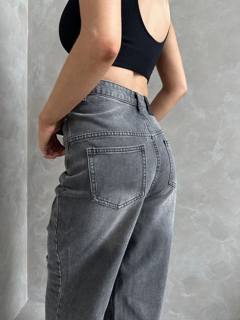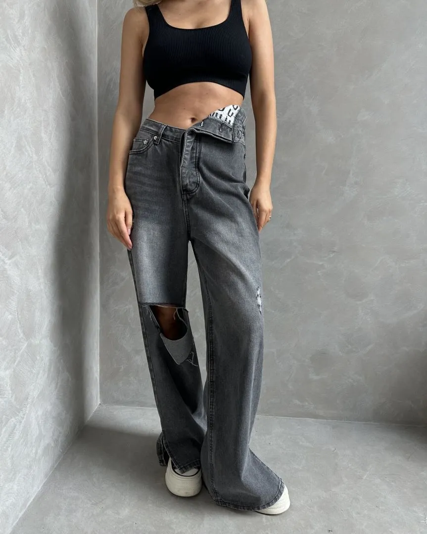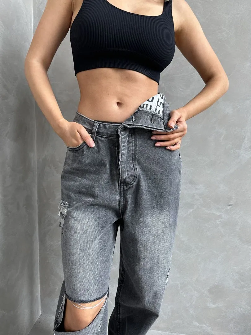 Джинсы с разрывами в черном цвете с акцентной талией